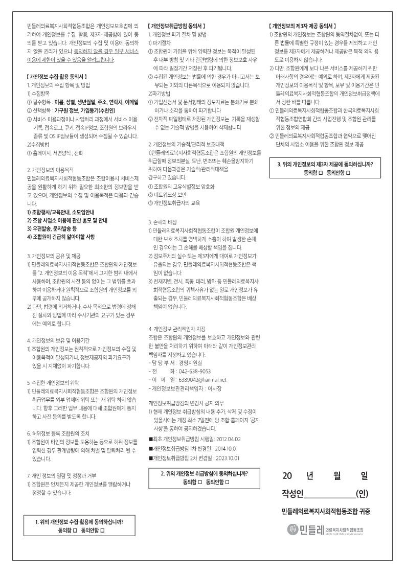 개인정보취급방침의 변경시 공지 의무 ⌈현재 개인정보 취급방침의 내용 추가, 삭제 및 수정이 있을시에는 개정 최소 7일전에 당 조합홈페이지 '공지사항'을 통해 공지하겠습니다⌋에 따라 아래와 같이 변경(안)을 공지합니다.