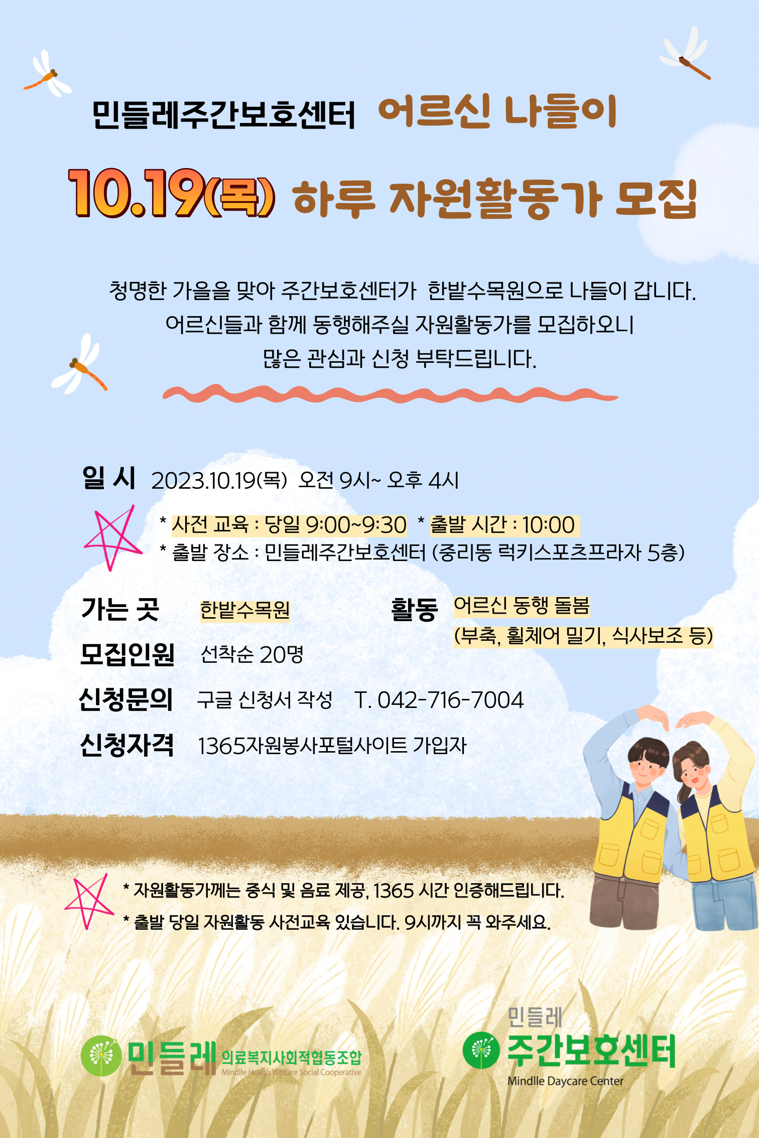 민들레주간보호센터에서 나들이 자원활동가를 모집합니다~ 주간보호센터 어르신들이 가을 나들이를 갑니다. 어르신들을 모시고 함께 동행할 “하루” 자원활동가를 모집하오니, 많은 관심과 신청 부탁드립니다.