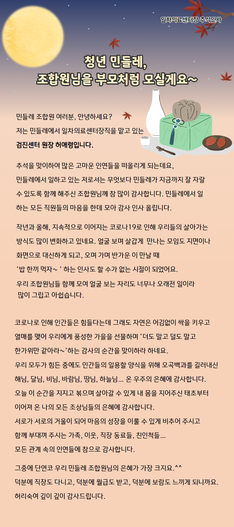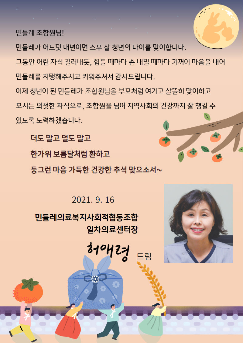 [일차의료센터장 추석인사] 청년 민들레, 조합원님을 부모처럼 모실게요