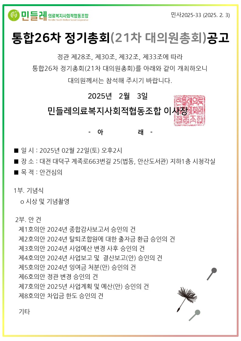 *대의원 총회는 위임이 되지 않습니다. 대의원님들은 꼭! 참석해 주세요